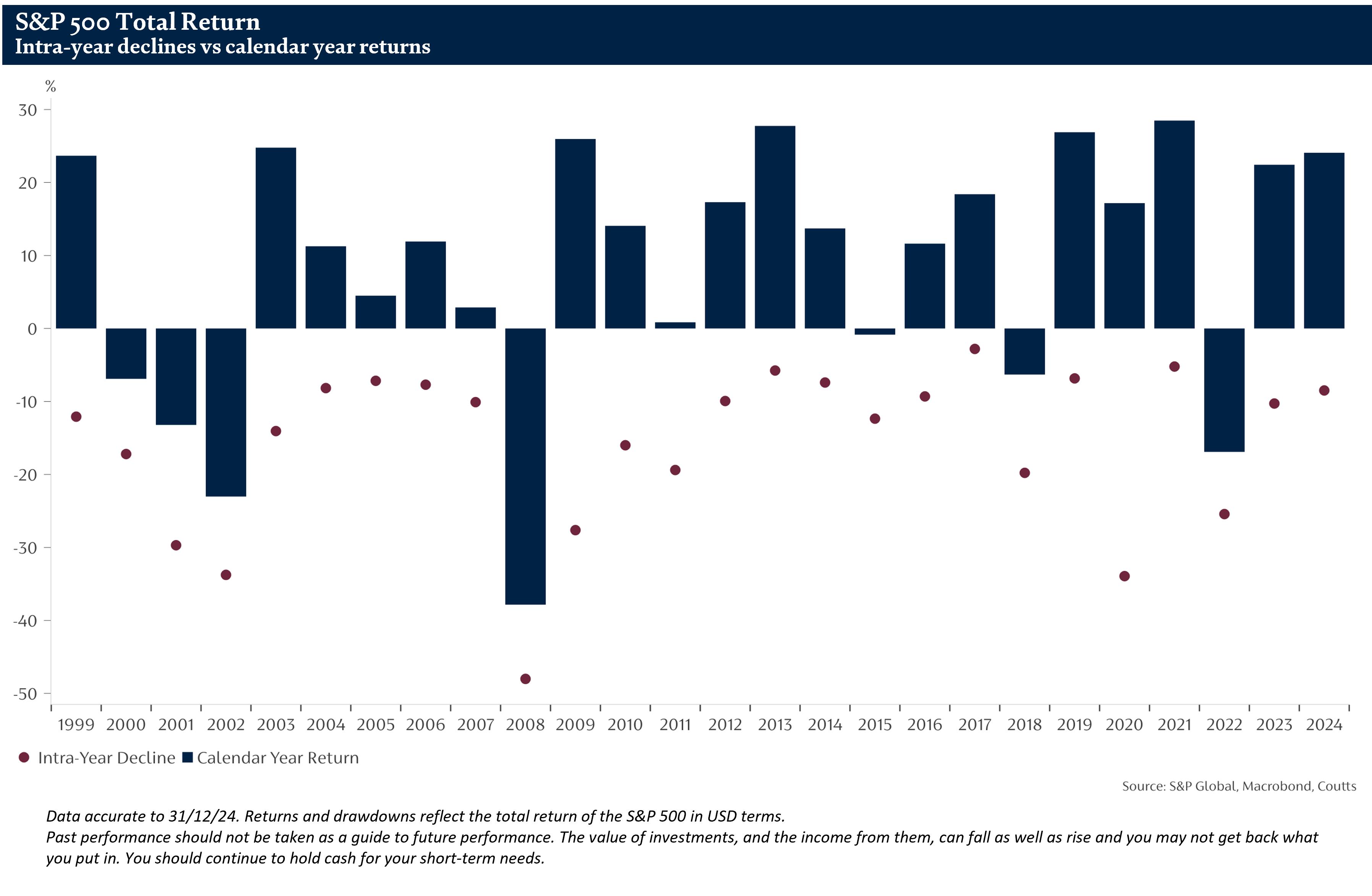 The chart below shows the S&P 500’s annual returns compared to its intra-year declines – peak to trough – between 1999 and 2024. Despite these mid-year declines, the index was able to return positive annual returns 19 times out of 26.