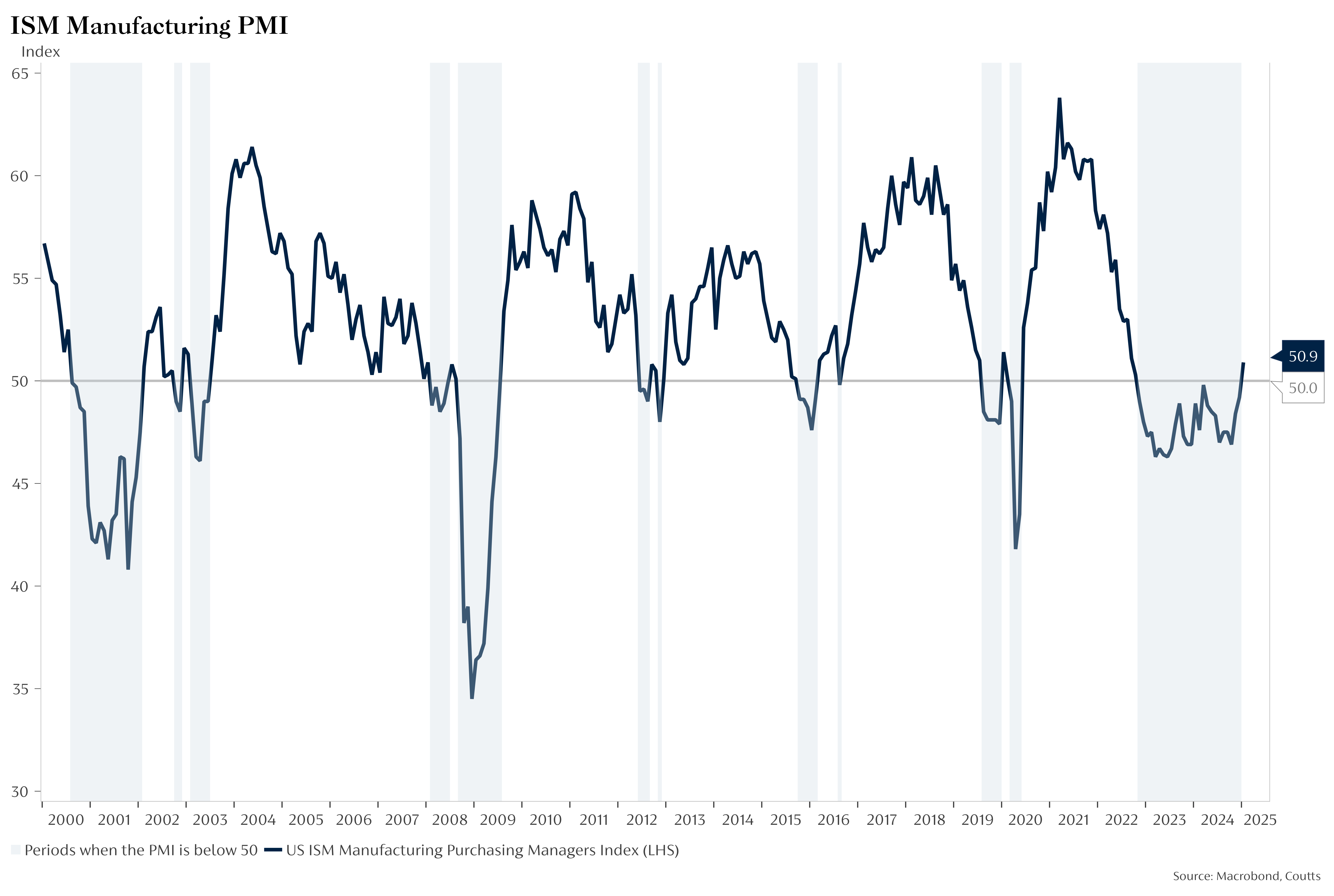 As detailed in the graph below, the industry is slowly ramping up its output for the first time in 16 months. The US ISM Manufacturing Purchasing Managers’ Index records the sector’s business activity. As of January 2025, it has surpassed 50 points – a key threshold which indicates activity is expanding.