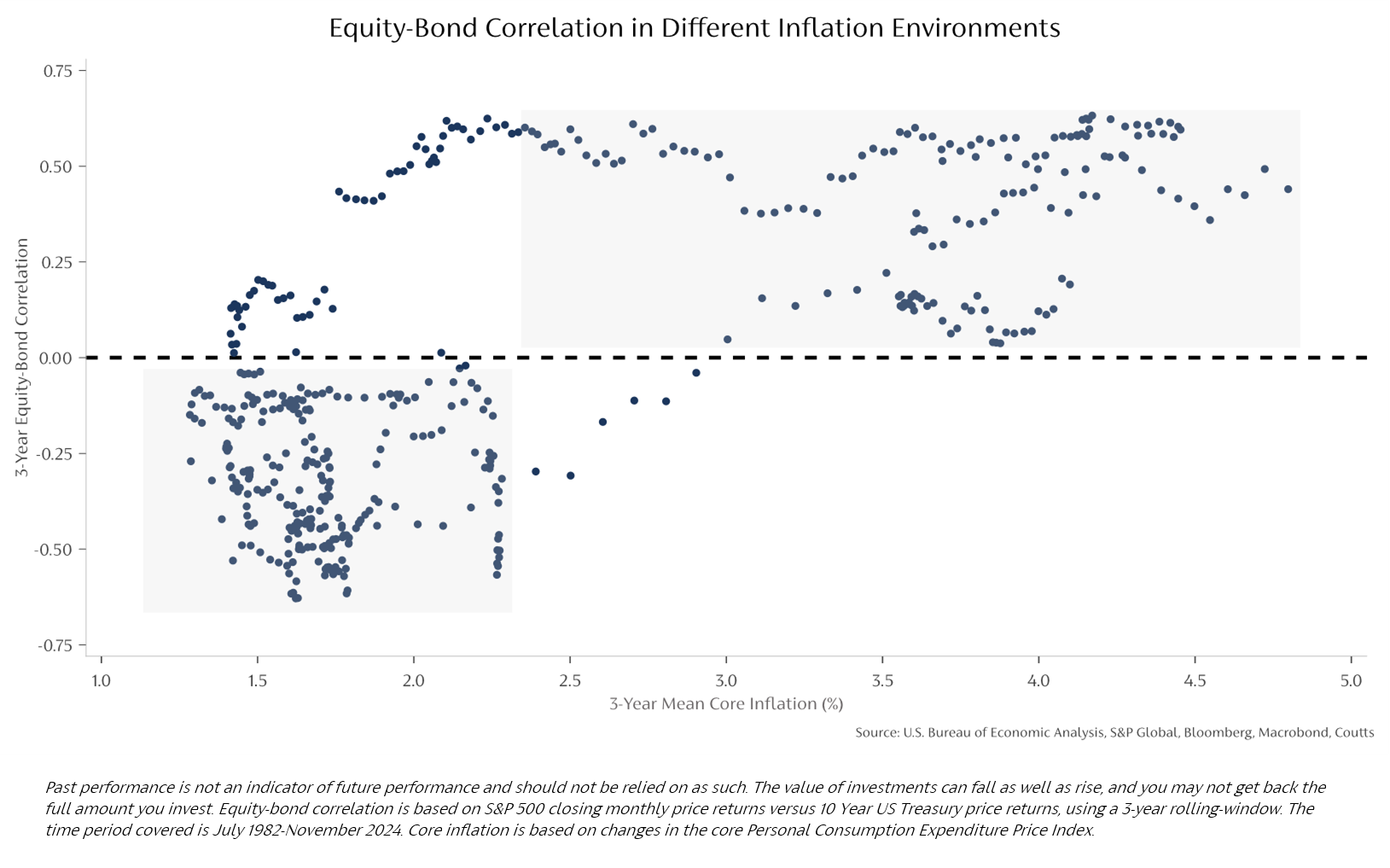 But once inflation surpasses the 3% threshold (x-axis), their correlation turns positive (y-axis). Both asset classes move in tandem, so when one goes up, so does the other. And more concerningly, when one goes down, so does the other.