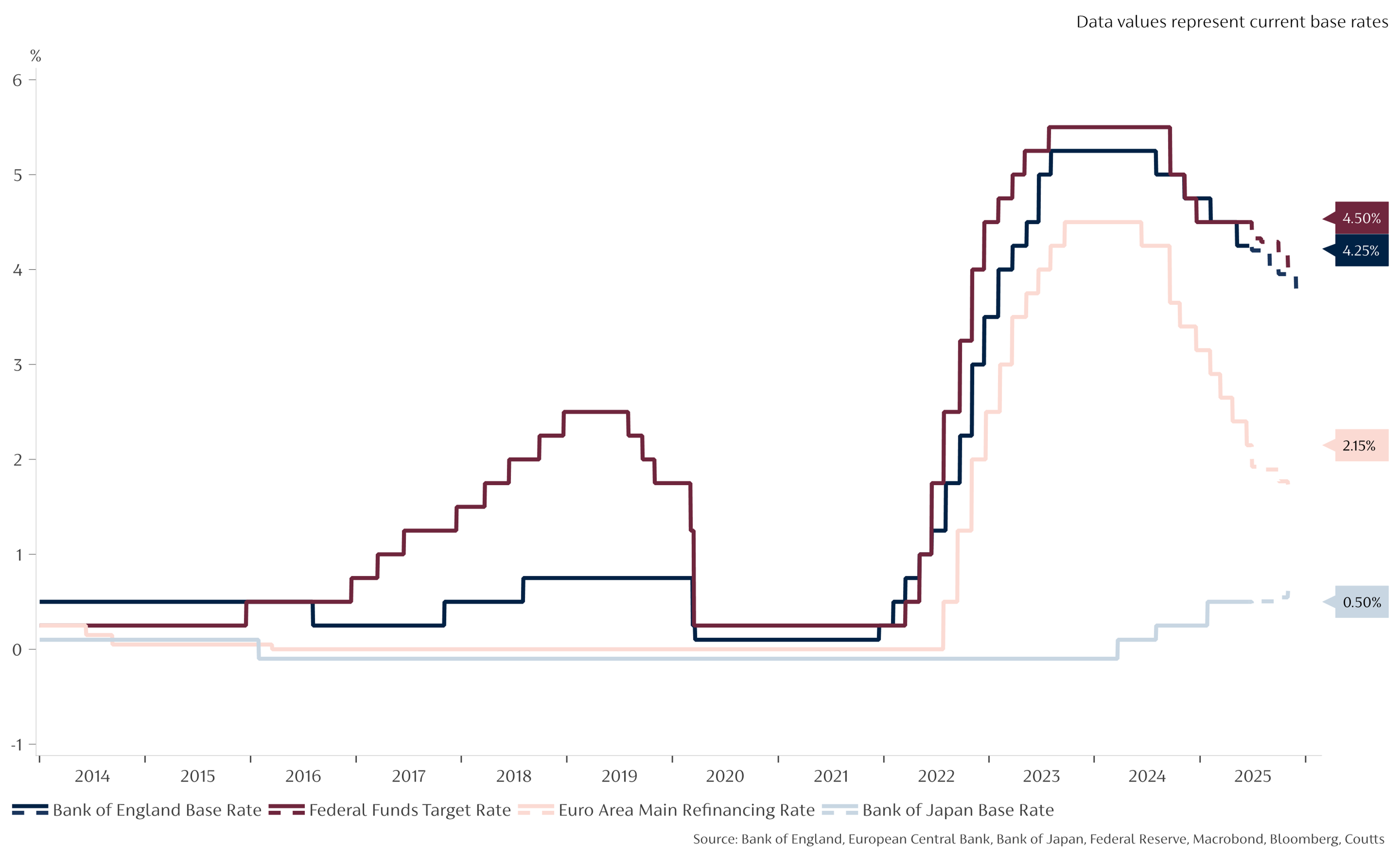 The journey to lower rates is continuing slowly. While Trump’s tariffs have impacted the global economy, a lower cost of borrowing on both sides of the Atlantic should potentially be supportive for businesses and equity markets. We continue to see resilient, though potentially slowing, growth as our base case, supporting our overweight to equities.